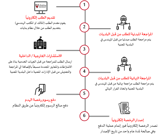 ملاحظة: تحول بعض طلبات تراخيص الهدم إلى الإدارة العليا لاعتمادها، وذلك استنادًا إلى عمر المبنى وحالته الإنشائية.
